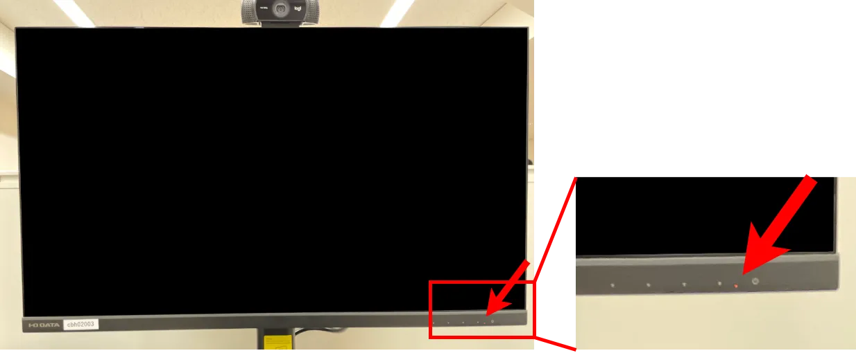 - ディスプレイの右下にある電源インジケータが光っているか確認してください.光っていないときは電源が切れていますので,電源ボタンを押して電源を入れてください.