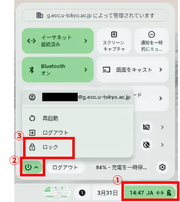 デバイスをロックするには,キーボード上で🔍+L,◉+L(Chromebookの場合),Windows+L(Chromeboxの場合)のいずれかのショートカットキー操作をしてください.もしくは,画面右下の時刻表示を押し,電源のアイコンを押し,「ロック」を押すことでもロックできます.