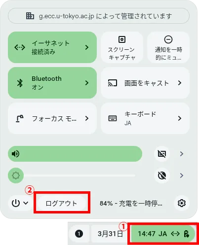 ログアウトするには,画面右下の時刻表示を押し,「ログアウト」を押してください.