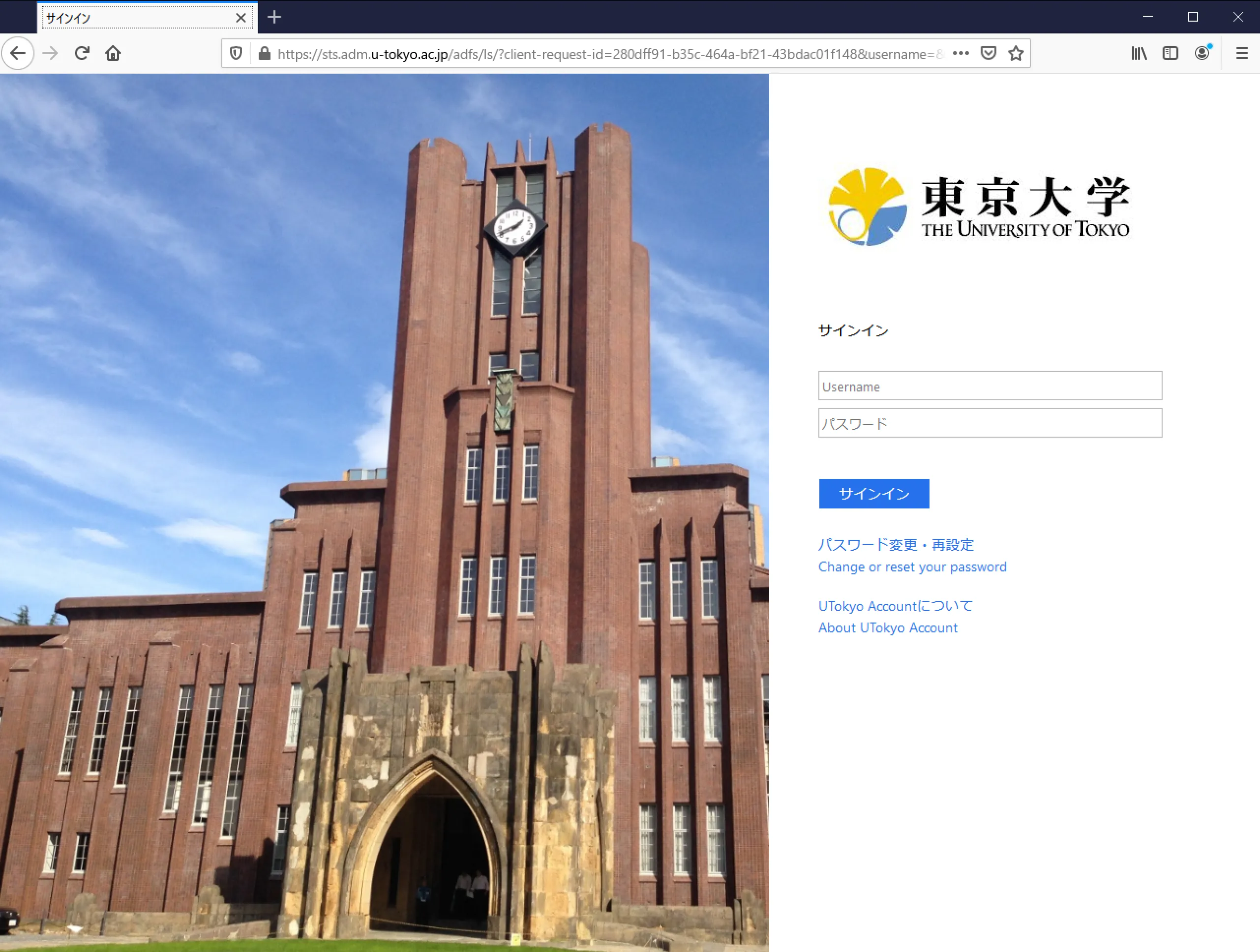 Step A: Go to https://vpn1.adm.u-tokyo.ac.jp/. When the UTokyo Account authentication page appears as illustrated below, log in with your UTokyo Account.