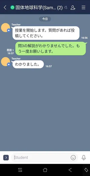 対面授業では、学生の表情を見て理解度を把握することができましたし、眠そうな学生を指名して発言させるといった対応も行っていました。教室で 70 人程度が参加する授業をするときは、教員が学生を指名しても、教室の後方からは誰が答えているのか見えにくく、ある程度匿名性を保ったやり取りができていました。一方、オンライン授業では、回答者の名前が画面に表示され、誰が答えているのかが明確化されてしまうため、教員側からは学生に質問しづらいと感じました。 そこで、匿名性が確保される LINE オープンチャットを導入して、授業中に学生の側から質問を送ってもらいました。一方向のコミュニケーションではありますが、LINE オープンチャットを導入することで、学生の理解度がわからないという問題はある程度改善されました。