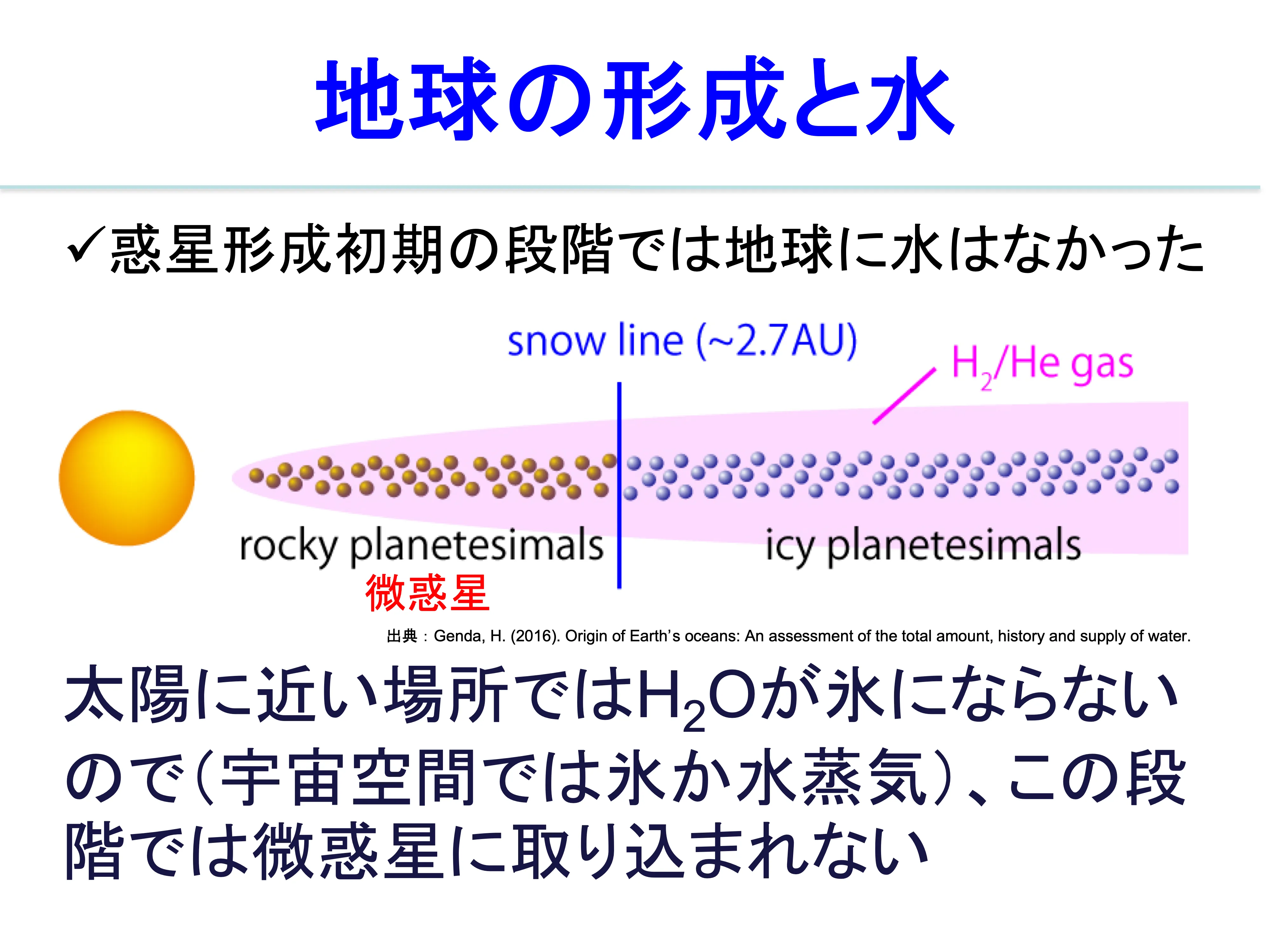 - 地球の誕生と進化:ジャイアントインパクト、マグマオーシャン、コア-マントルの分離から始まる固体地球の形成と進化について議論する