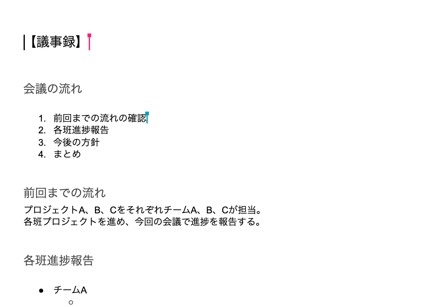 上の例では,「【議事録】」を「見出し2」に,「会議の流れ」「前回までの流れ」「各班進捗報告」「今後の方針」「まとめ」をそれぞれ「見出し3」に設定しました.