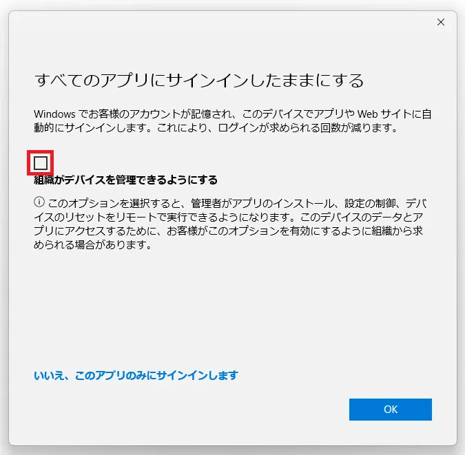 - 「組織がデバイスを管理できるようにする」のチェックを外してください.