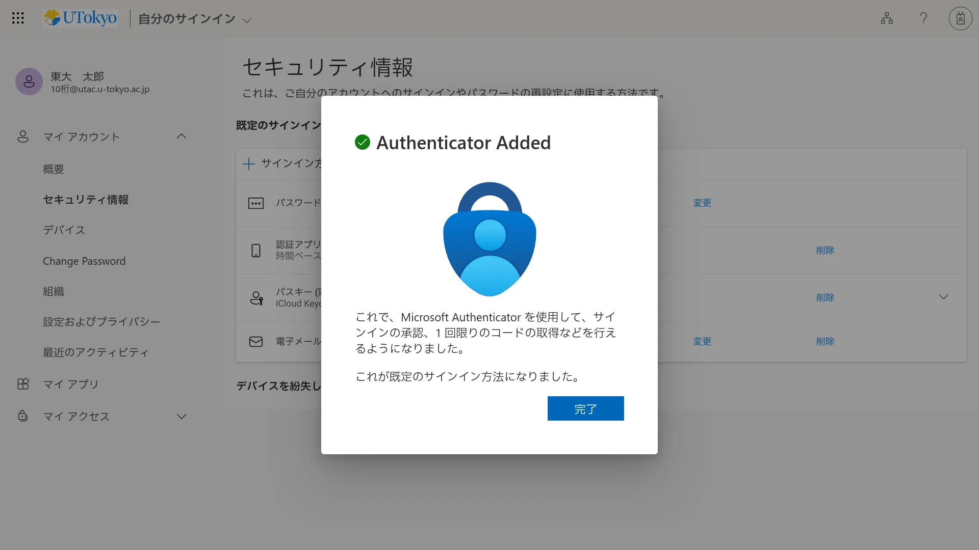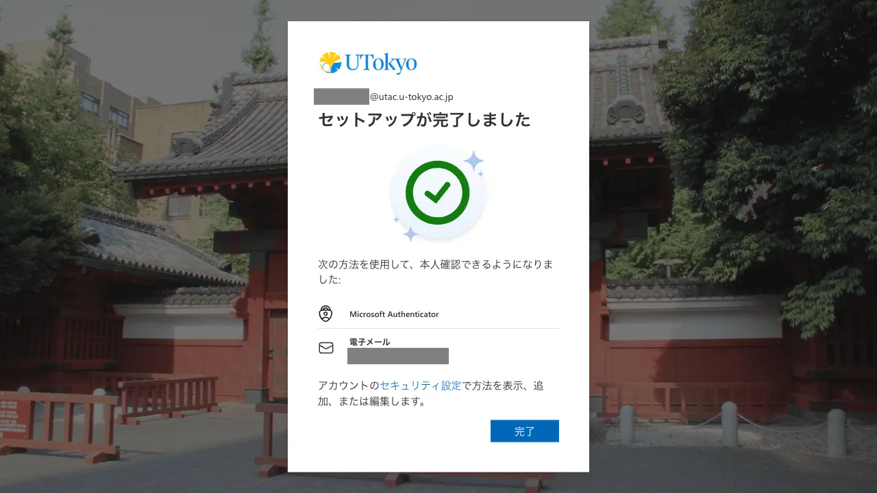 以上で多要素認証の初期設定手順は完了ですが,設定がシステム全体に反映されるまで最大約30分かかります.多要素認証の設定が完了していないとサインインできないようなシステムを利用したい場合は,それまでしばらくお待ちください.