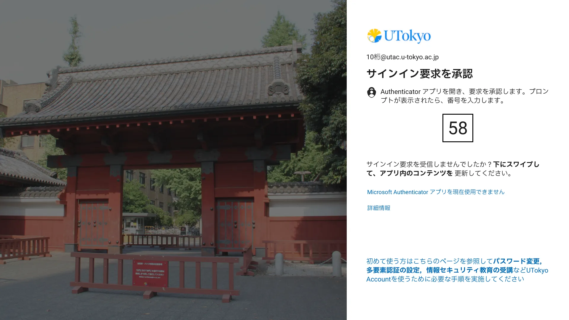 2. UTokyo Account(数字10桁の共通ID + @utac.u-tokyo.ac.jp)とパスワードを入力してログインしてください.