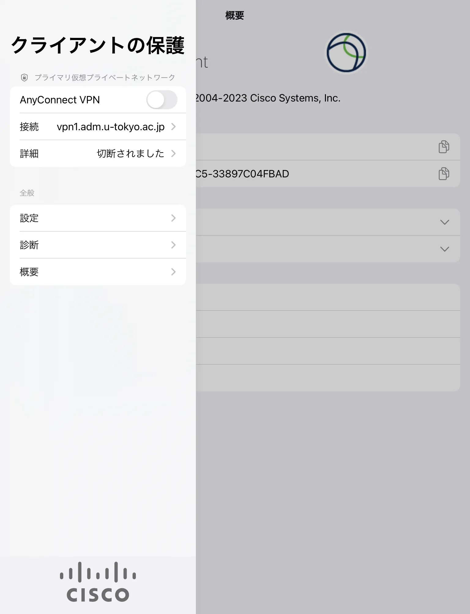 VPNを切断する際は,この画面左上のトグルボタンをタップして「詳細」が「切断されました」になったことを確認してください.
