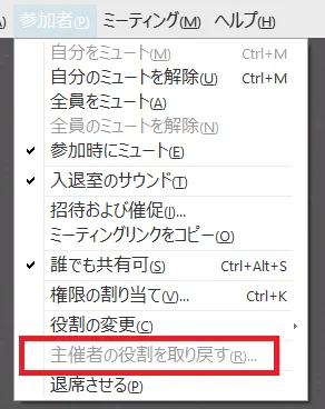 そんなときは,参加者として再度参加後,「参加者」メニューから「主催者の役割を取り戻す」を押し,会議を作成したときに表示されている「主催者キー」を入力すると,主催者に戻ることができます.