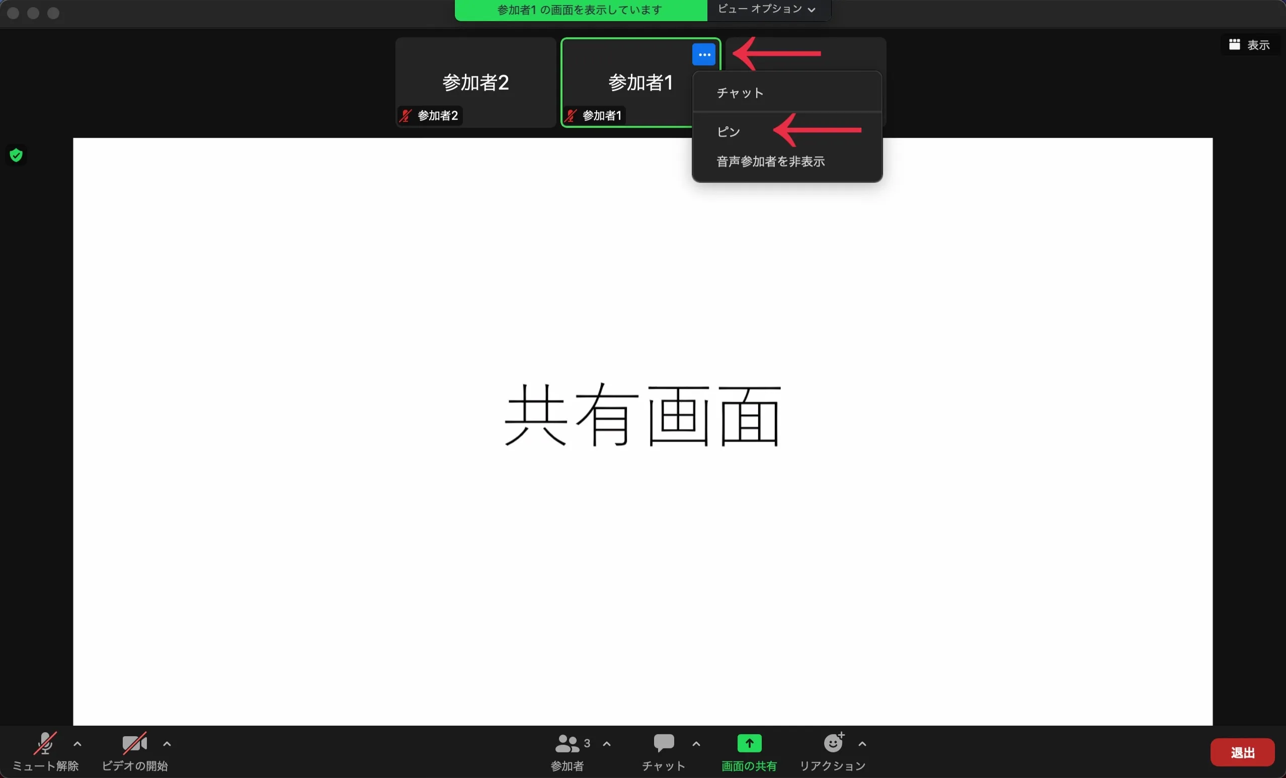 共有画面よりも参加者のビデオを大きく表示する別の方法として,共有画面と参加者のビデオを入れ替えるスワップという機能も存在しています.参加者のビデオの右上の「…」を押し,ピンを設定すると,一時的に共有画面と参加者のビデオを切り替えることができます.