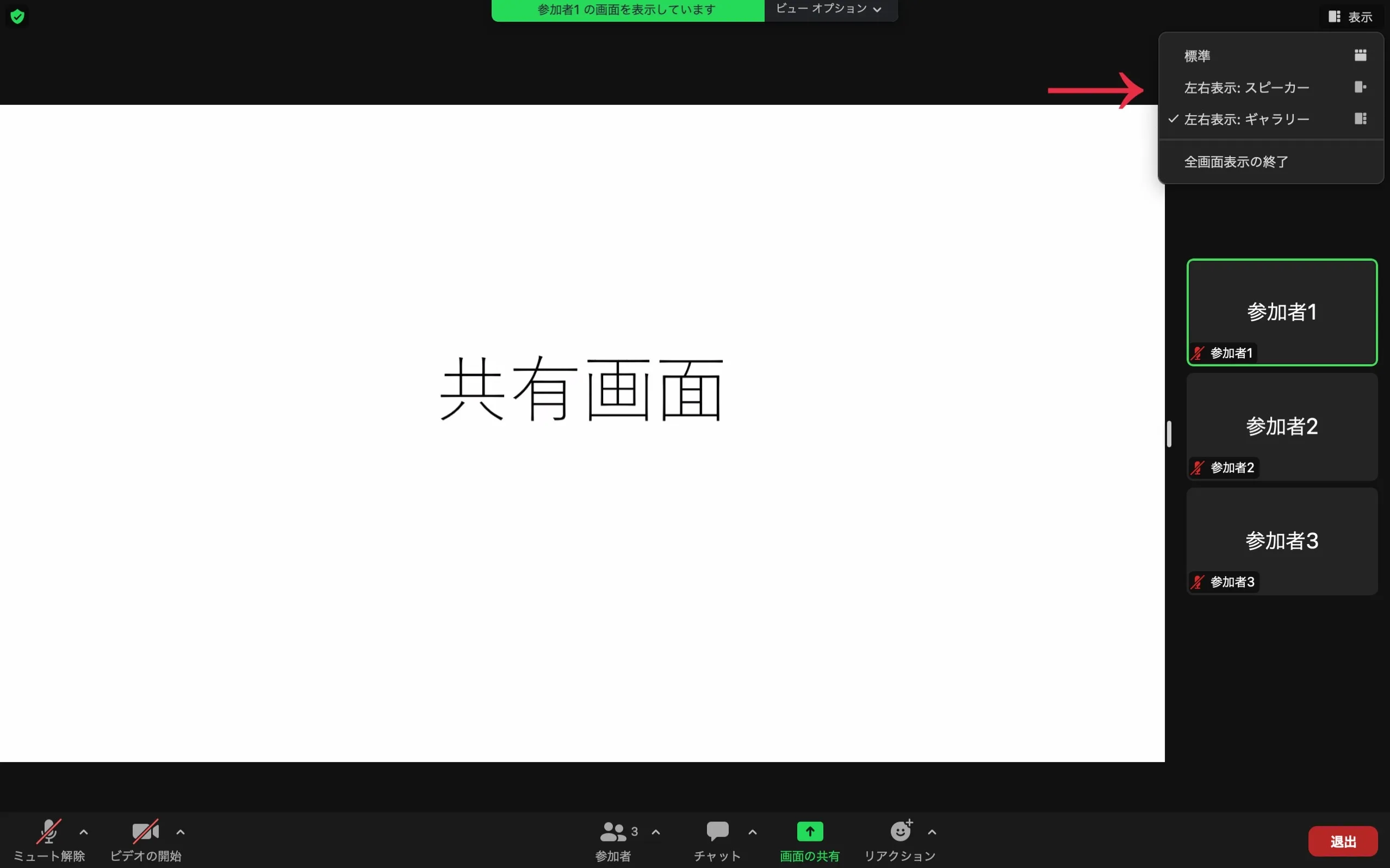 共有画面と参加者のビデオを左右に並べて表示する(左右表示)