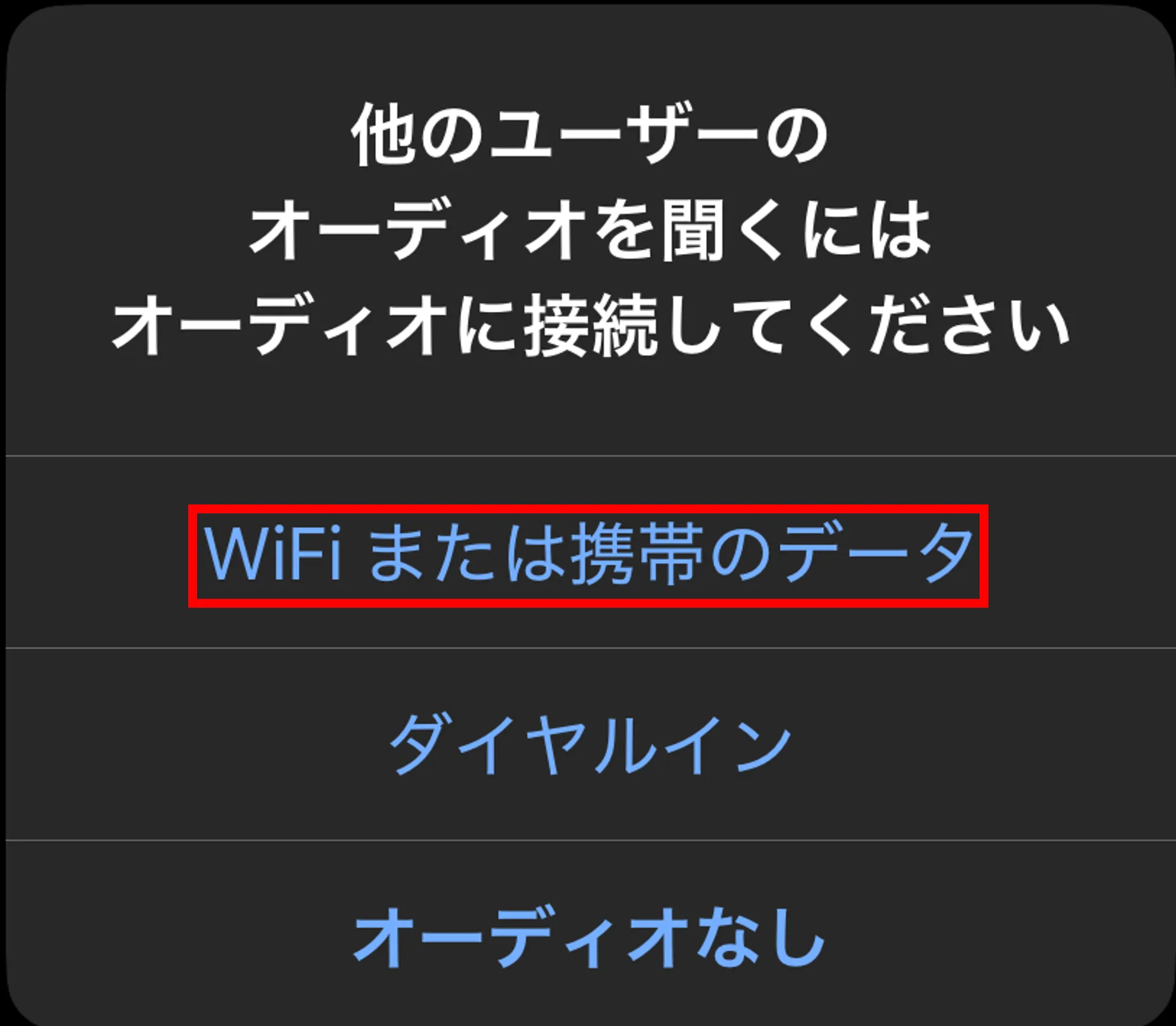 以下の画面が表示された場合は,「WiFi または携帯のデータ」ボタンを押してください.この画面が表示されなかった場合には自動的にオーディオに接続されています.